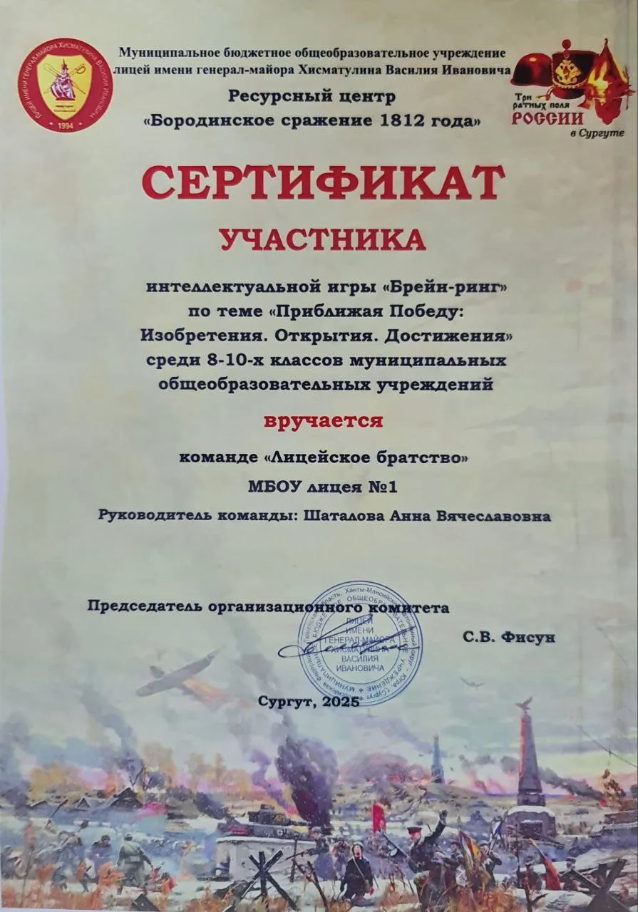 Подготовку лицеистов к турниру осуществляла Шаталова Анна Вячеславовна, учитель истории и обществознания. Ее профессионализм и увлеченность темой помогли ребятам систематизировать знания и уверенно чувствовать себя во время игры.